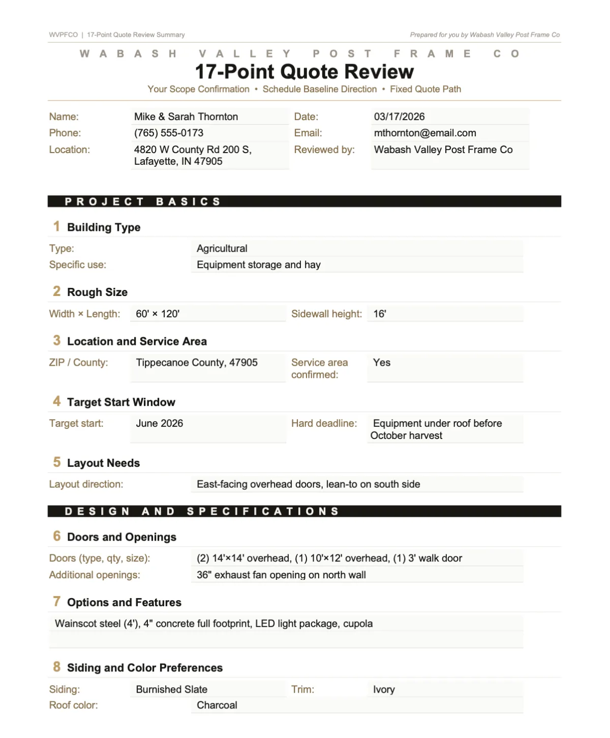 A structured review of your building type, size, layout, doors and openings, site access, concrete, structural loads, color and finish selections, timeline, and pricing — all 17 factors that determine whether your build stays on time and on budget. You receive it in writing and you keep it whether you build with us or not.